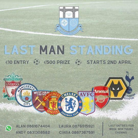 If you would like to join the Last Man Standing competition entries must be in by Thursday 31st March @9pm . Competition starts on Sat. 2nd April. Entry €10 per person.